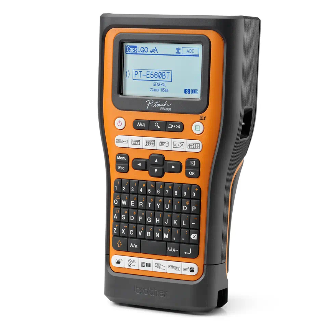 The Brother PT-E560BTVP is a professional handheld industrial label maker designed for demanding environments such as electrical, datacom, and AV installations. It delivers fast, precise, and durable labeling for a variety of applications. The device supports label widths ranging from 3.5mm to 24mm, including laminated labels and heat shrink tubes, ensuring versatility across different job requirements. Its Bluetooth connectivity allows wireless label creation via mobile devices, while USB-C support enables direct PC printing through P-touch Editor software. A dual auto-cutter simplifies label cutting, and the rechargeable Li-ion battery ensures uninterrupted use in the field. Additional accessories like a hard carrying case, patch panel ruler, and hand strap make it convenient and durable for daily industrial use.