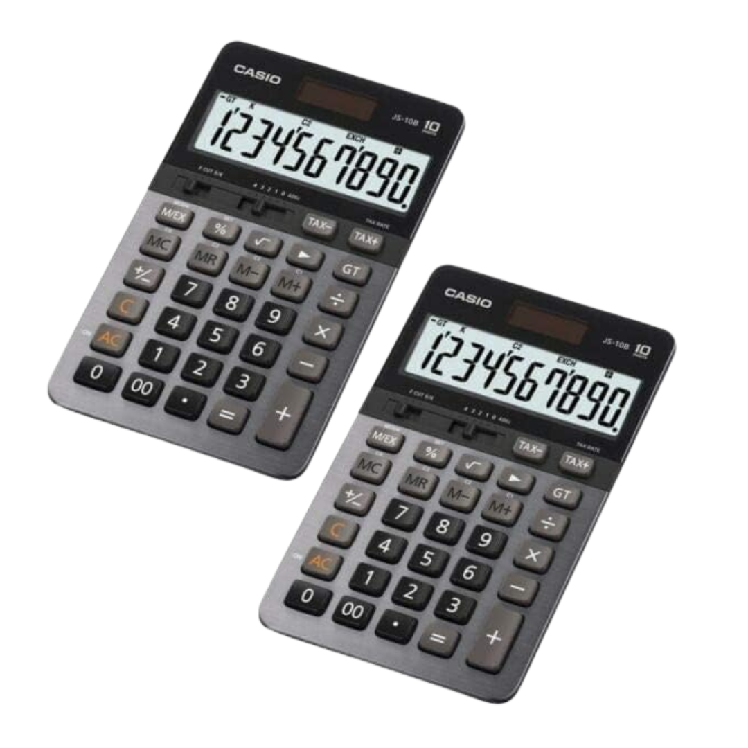 The Casio JS-10B Two Piece Calculator is a stylish and reliable desktop calculator designed for everyday business and accounting needs. It features a large 10-digit display with bold, easy-to-read numbers, ensuring clear visibility for quick and accurate calculations. The two-piece durable construction and metallic finish give it a premium appearance while maintaining strong durability for long-term use.