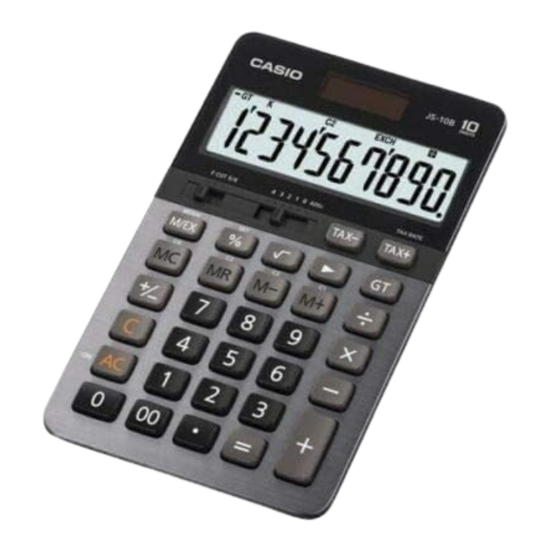 The Casio JS-10B desktop calculator is designed for professional and everyday use, combining functionality, clarity, and durability. It features a large 10-digit angled display that provides excellent visibility and reduces errors during long calculation sessions. With its dual power system (solar and battery), the calculator ensures continuous performance under any lighting condition.