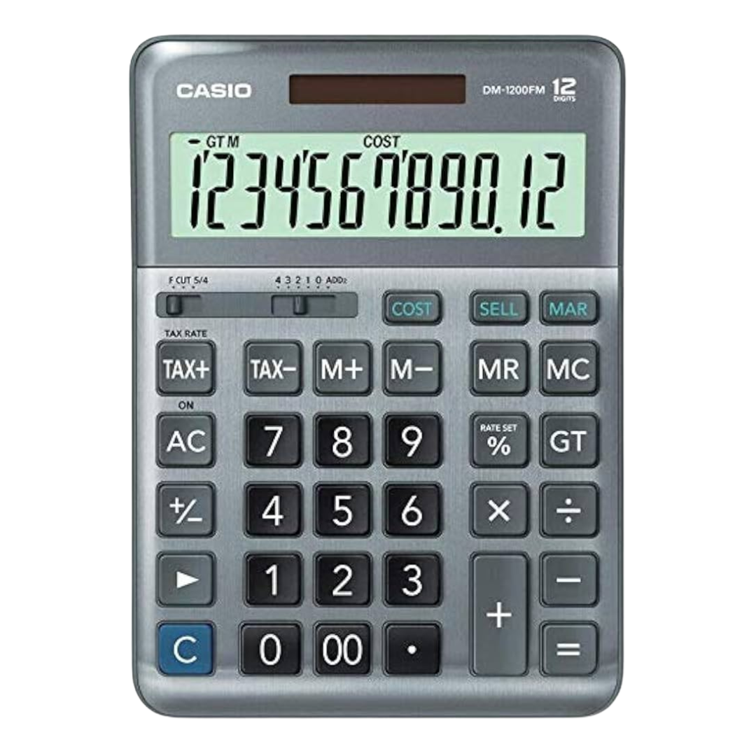 The Casio DM-1200FM Desktop Electronic Calculator is designed to deliver accuracy, durability, and ease of use for professionals and home users alike. Featuring a large 12-digit angled display, it ensures clear visibility even during long working hours. The calculator’s sturdy build with a metallic finish gives it a premium and durable appearance, perfect for office desks or counters.