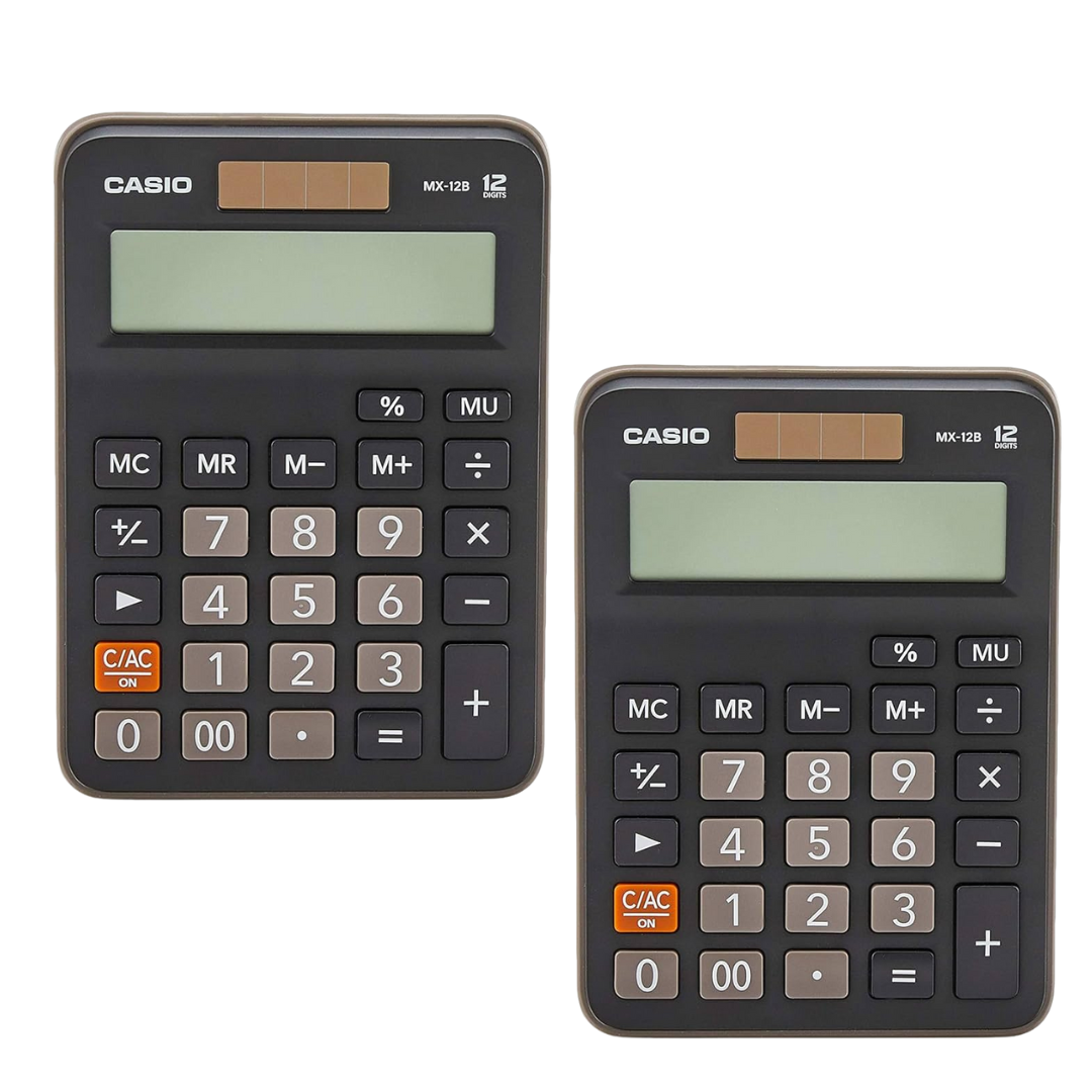 The Casio MX-12B Calculator Two Piece Set is a dependable desktop calculator ideal for daily office, school, and home use. It features a 12-digit extra-large display that ensures clear visibility and easy reading of numbers. The calculator operates on dual power sources — solar and battery — allowing uninterrupted use even in dim lighting conditions.