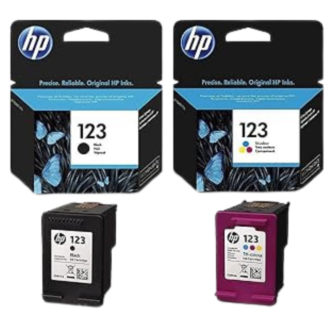 The HP 123 Ink Cartridge Set combines the Black (F6V17AE) and Tri-Color (F6V16AE) cartridges to deliver dependable printing performance for both home and small office environments. Each cartridge is built with precision to provide clear, sharp text and bright, vivid colors on every page. The ink formulation ensures smooth flow for consistent output, preventing smudging and streaking while maintaining rich tones for professional-quality prints.